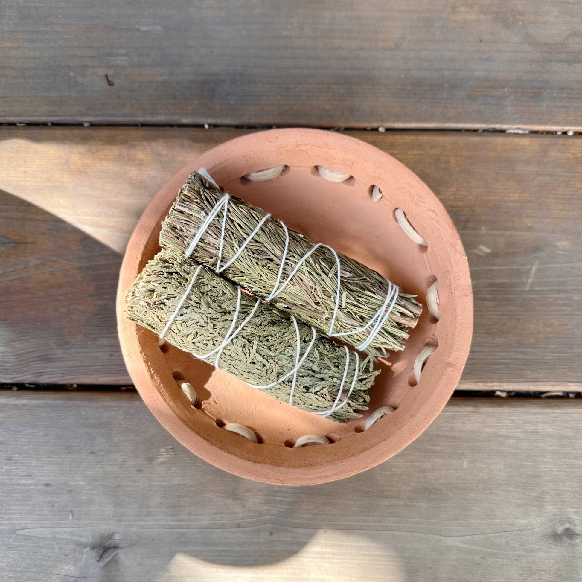This terracotta bowl can be used as a catchall dish for small items, herbs, or a beautiful decorative accent in your kitchen. Hand thrown with rattan wrapping.