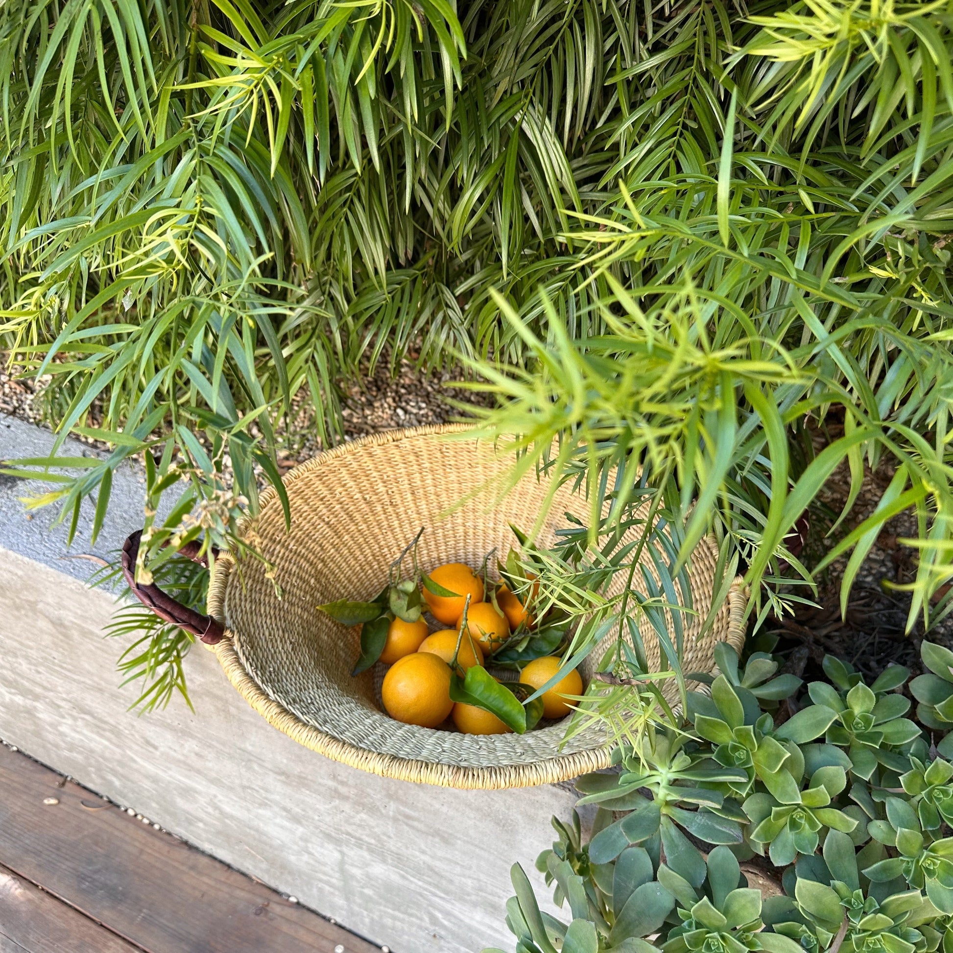 This deep woven basket is a Sustainable Landscapes LA staple. Made from organic elephant grass, it is perfect for garden harvests, farmers markets, home decor and storage. The brown leather wrapped handles add an element of elegance and durability.